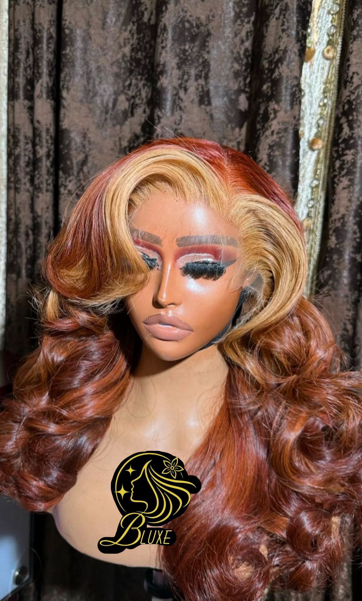 Luxurious copper red and blonde highlight wig with deep waves and natural-looking lace front. Pre-styled, voluminous, and ready-to-wear.